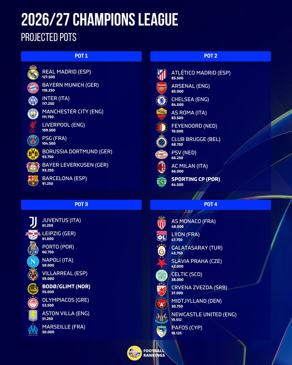 A draw, which may be conducted digitally, determined the pairings for the league phase. The 36 clubs were divided into four pots of nine clubs. The pots were composed according to the club coefficient rankings established at the beginning of the season, with the UEFA Champions League titleholder being the top seed in pot 1.